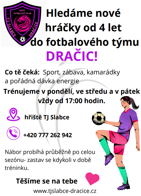 Jsme Dračice, dívčí fotbalový tým z malebného městyse Slabce (okres Rakovník). Trénujeme na krásném hřišti TJ Slabce , kde kromě fotbalu budujeme, týmového ducha
